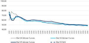 The Company sells REGOs bundled with power sales through existing PPAs as well as unbundled via bilateral arrangements.  Where REGOs have been sold at a fixed price, these known prices are used in the calculation of NAV. 93% of REGOs generated for the 2024-25 compliance year have been sold at an average price of £3.9/MWh. 29% of expected REGOs for the 2025-26 compliance year have been sold at £6.9/MWh. Unbundled, unsold REGO volumes of up to c.645GWh/annum are reflected in the NAV in line with third-party advisor forecasts (£5/MWh until March 2028 and then £1.5/MWh for the remaining life of the asset).